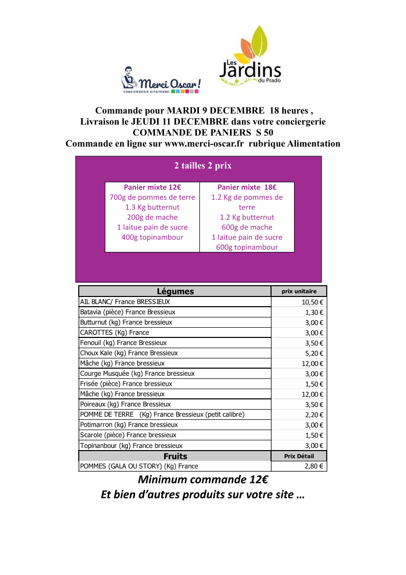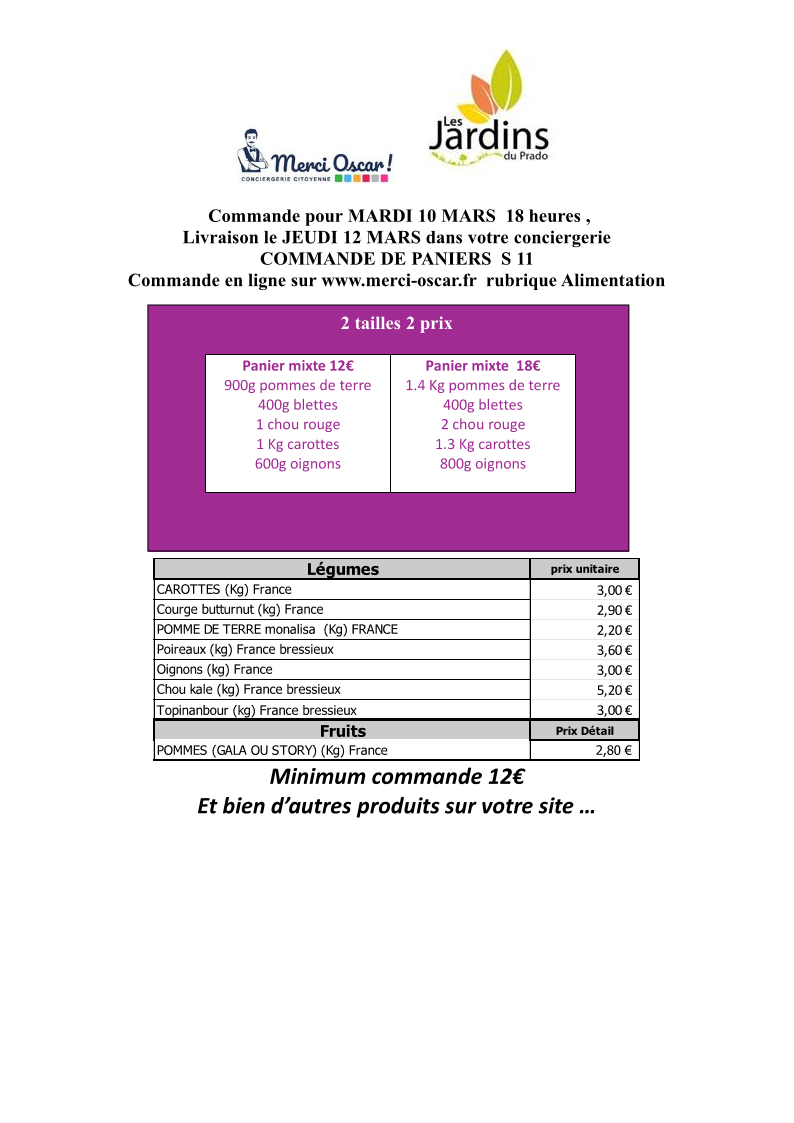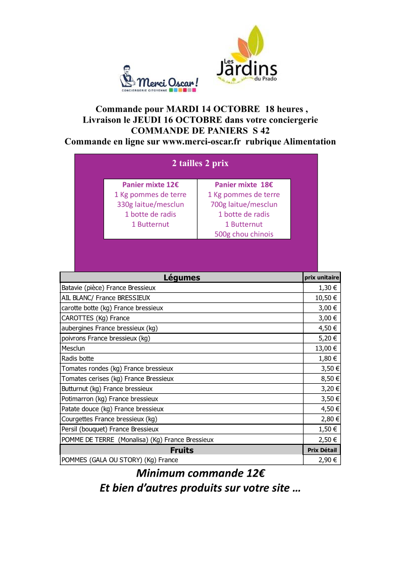 Commande du jeudi au mardi 18h. Livraison vers 11h le jeudi sur votre conciergerie.